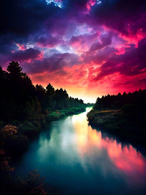 The sunset in the background is nothing short of spectacular, with a vibrant and dramatic sky that is a symphony of colors. The hues of mauve, cinnabar, cyan, and blue blend together in perfect harmony, creating an ethereal and unforgettable vista. The sky is accented by brilliant red clouds, adding a touch of scarlet to the mix, resulting in a sky that resembles a sea of purple. The photographer has masterfully captured this moment in time, making the river appear like a river of blue fire, providing a visual feast for the eyes.